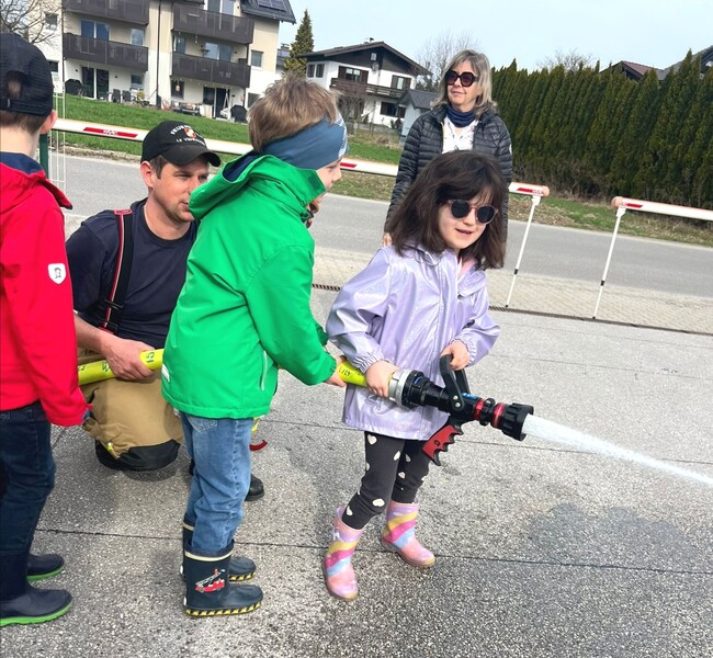 Zum Abschluss unseres Lehrausganges durfte noch jedes Kind mit dem Wasserschlauch spritzen, das war lustig!